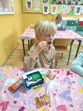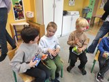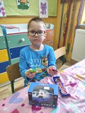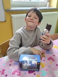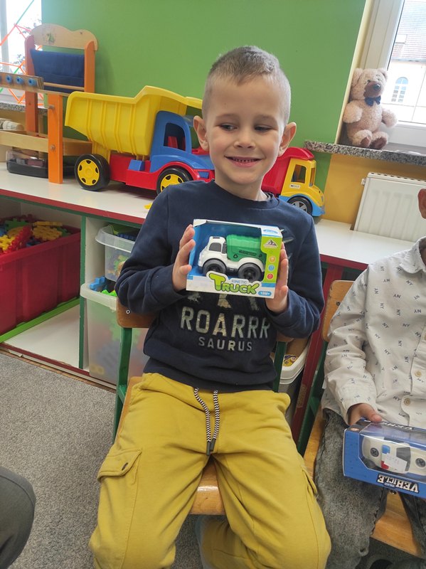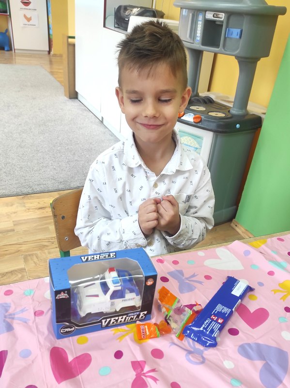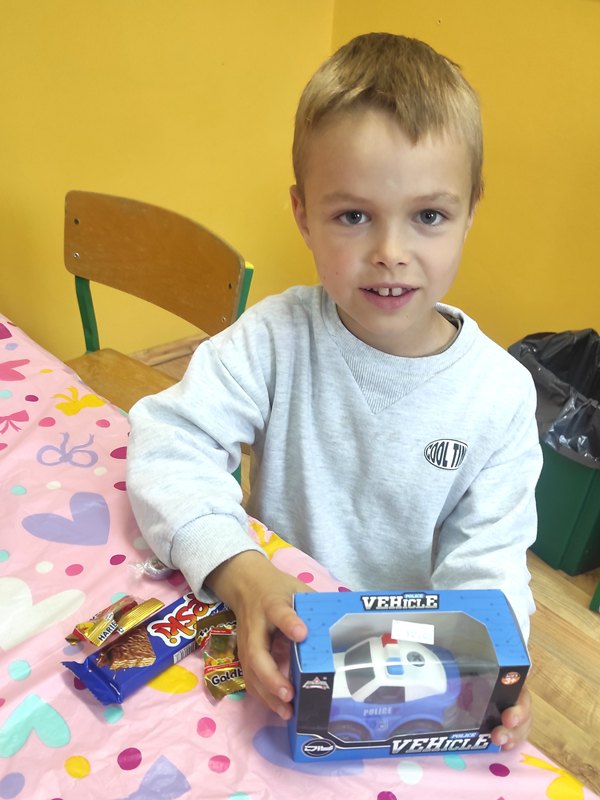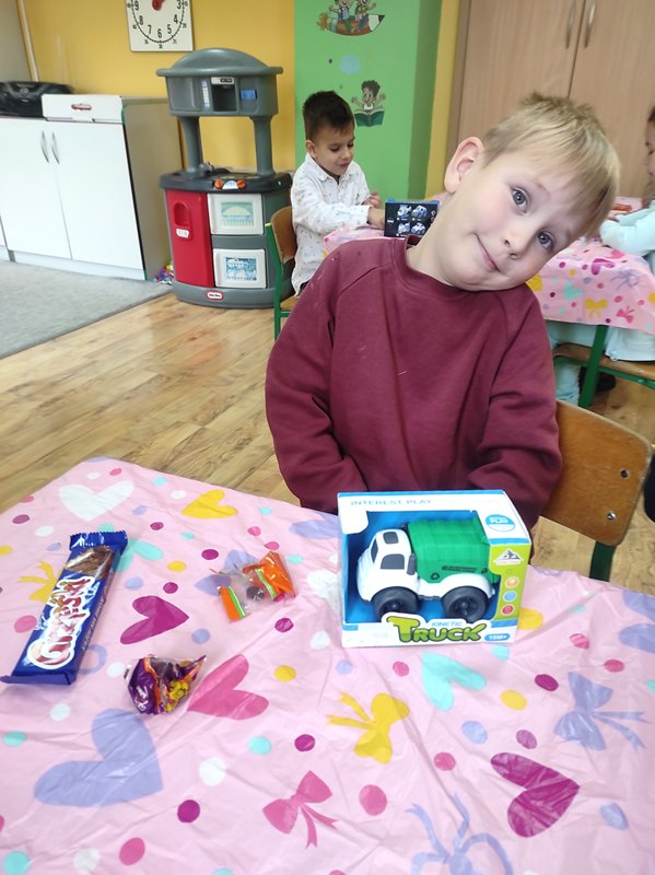 Z tej okazji nasi chłopcy otrzymali drobne upominki — zabawki oraz słodkie niespodzianki. To był czas pełen uśmiechu i radości!