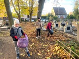 W środę 29 października 2025 r. uczniowie należący do Szkolnego Koła Wolontariatu wzięli udział w akcji sprzątania cmentarza parafialnego. W przedsięwzięciu uczestniczyli wybrani uczniowie z klas I–VIII. Wspólnie grabili liście, porządkowali alejki i groby. Na zakończenie wszyscy zebrani pomodlili się za dusze zmarłych. To była piękna lekcja troski, wspólnoty i pamięci o tych, którzy odeszli.