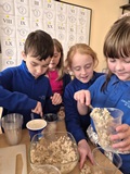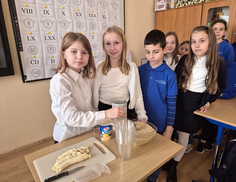W czwartek 6 listopada 2025 r. na zajęciach literacko-kulinarnych poznaliśmy przyjaciółkę naszej książkowej Cecylki Knedelek, a mianowicie gąskę Walerię. Lubimy opowieści o mieszkańcach ul. Naleśnikowej, a jeszcze bardziej uwielbiamy ich przepisy kulinarne. Tym razem przygotowaliśmy owsiankę bananową. Są jej zwolennicy i ci, którzy za nią nie przepadają. Ciekawe, kto się zainspiruje i będzie przynosił owsiankę na drugie śniadanie?