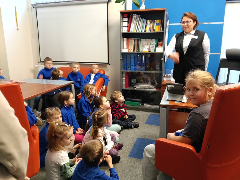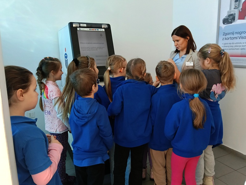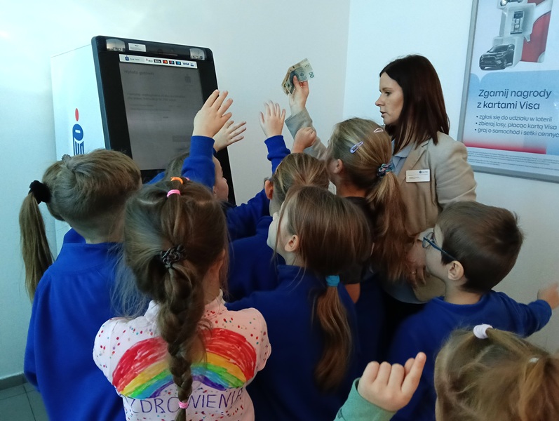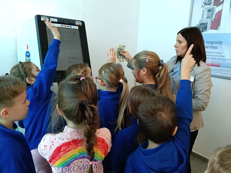 Dnia 21 listopada 2025 r. uczniowie klasy I i III byli na zajęciach w PKO Banku Polskim. Sprawdzaliśmy, kto pracuje w banku, skąd się biorą pieniądze i to, jak oszczędzać. Wpłacaliśmy i wypłacaliśmy banknoty z bankomatu oraz rozmawialiśmy na temat budżetów domowych.