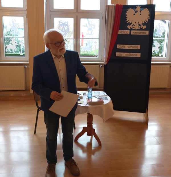 W przeddzień rocznicy wprowadzenia stanu wojennego w Polsce — przypomnijmy, że ogłoszono go w dniu 13 grudnia 1981 r. — uczniowie naszej szkoły spotkali się z Mieczysławem Ślesickim, działaczem Niezależnego Samorządnego Związku Zawodowego "Solidarność". Nasz gość w czasie stanu wojennego trafił do więzienia za wywieszenie przed budynkiem tzw. bunkra w Trzciance — obecnie znajdującego się tu supermarketu, plakatu odnoszącego się do wydarzeń z 1970 r. na Wybrzeżu. W wyniku wspomnianych działań Mieczysław Ślesicki został skazany na karę pozbawienia wolności. "Po wyjściu z więzienia znalezienie pracy było bardzo trudne. Władzy komunistycznej nie udało się nas złamać pomimo takich represji" — mówił nasz gość podczas swojego wystąpienia.