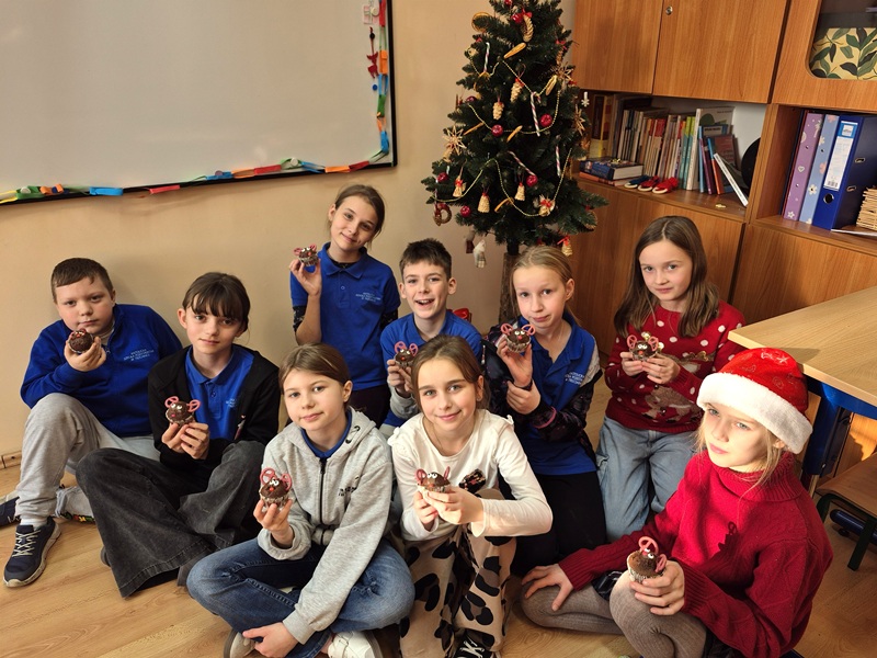 W dniu 18 grudnia 2025 r. podczas zajęć literacko-kulinarnych jak zwykle połączyliśmy świat książek z praktycznym działaniem. Uczniowie, inspirowani tematyką świąteczną, przygotowali czekoladowe muffiny w formie uroczych reniferków. Nasze działania rozwijały kreatywność, uważność na instrukcję oraz umiejętność współpracy, a wspólne kucharzenie, a raczej cukierniczenie, stało się okazją do rozmów o literaturze i tradycjach bożonarodzeniowych. Efektem były nie tylko pachnące wypieki, ale także dużo radości i satysfakcji z własnoręcznie wykonanej pracy.