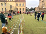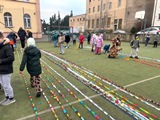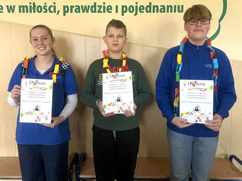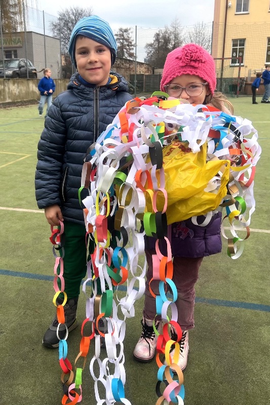 W czwartek 18 grudnia 2025 r. podsumowaliśmy zainicjowany przez Samorząd Szkolny i klasę V szkolny konkurs na najdłuższy łańcuch choinkowy. Wykonawcami najbardziej okazałego, mierzącego 261 metrów łańcucha są uczniowie klasy VIIIa, miejsce II zajęła klasa V, a miejsce III przypadło ex aequo klasom VI i VII. Na wyróżnienie zasługuje łańcuch z pociętych gazetek reklamowych wykonany przez uczniów klasy III — gratulujemy pomysłowości! Największą nagrodą dla wszystkich klas, które zaangażowały się w to dzieło, był wspólnie spędzony czas oraz emocje, jakie towarzyszyły podczas pomiarów, które miały miejsce na boisku szkolnym.