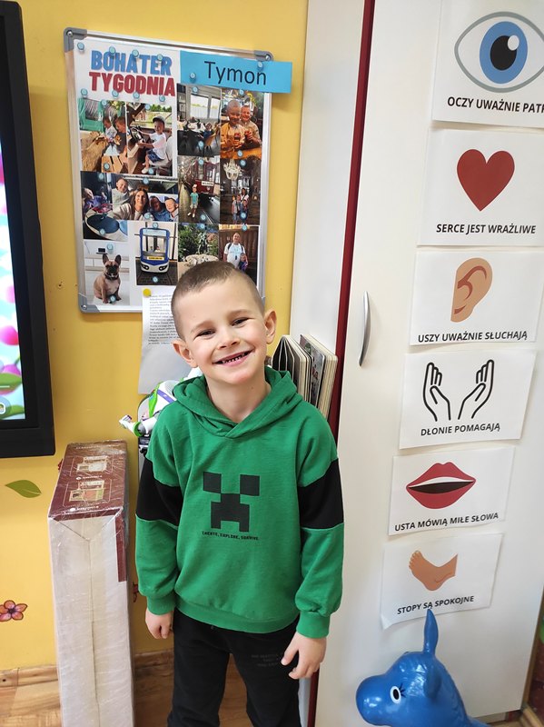 W naszym oddziale przedszkolnym od września do grudnia 2025 r. realizowana była inicjatywa "Bohater Tygodnia". Przedszkolakiem o takim statusie mogło zostać każde dziecko z naszego zespołu. Wybrany zerówkowicz przez cały tydzień, od poniedziałku do piątku, mógł przynosić do sali swoje zabawki z domu. Miał również przywilej ustawiania się jako pierwszy w parze podczas wszystkich wspólnych wyjść.