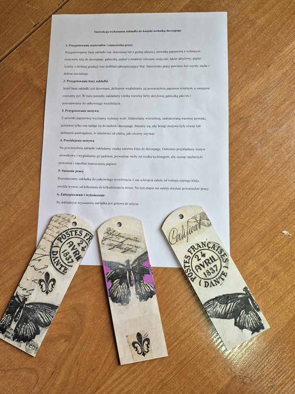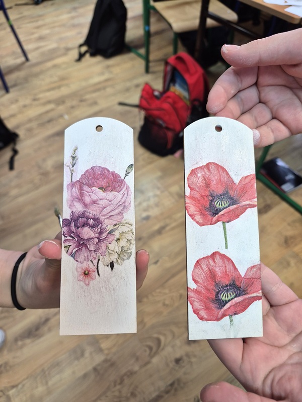 Podczas lekcji języka polskiego w klasie VI pozostajemy w kręgu tematyki edukacji czytelniczej. W czwartek 15 stycznia 2026 r. młodzi czytelnicy przygotowywali zakładki do książek techniką decoupage. Zajęcia miały charakter praktyczny i wymagały uważnego czytania ze zrozumieniem instrukcji krok po kroku, co pozwoliło ćwiczyć koncentrację oraz umiejętność stosowania informacji w działaniu. Uczniowie samodzielnie planowali kolejne etapy pracy, dobierali motywy dekoracyjne i starannie je komponowali. Wykonane zakładki mogą stać się nie tylko estetycznym efektem zajęć, ale również pretekstem do rozmowy o książkach i sposobach dbania o nie. Lekcja wpisywała się w działania promujące czytelnictwo, pokazując, że kontakt z nimi może łączyć czytanie, twórczość i przyjemność.
