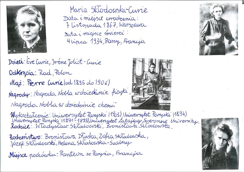 W piątek 16 stycznia 2026 r. podsumowaliśmy szkolny konkurs plastyczny na plakat pt. "Maria Skłodowska-Curie w laboratorium chemicznym". Eliminacje stworzyły okazję do poznania noblistki i jej wielkich odkryć. Uczestnicy przypomnieli, że Maria Skłodowska-Curie była osobą niezwykle pracowitą i odważną — jeździła na rowerze, co w jej czasach nie było popularne wśród kobiet, a także jako jedna z pierwszych kobiet zdobyła prawo jazdy. Jej pasja do nauki, wytrwałość i ciekawość świata stały się inspiracją do stworzenia pomysłowych i różnorodnych prac plastycznych.