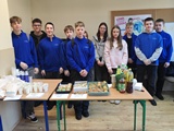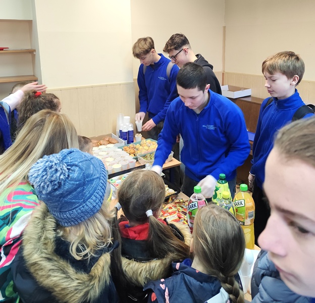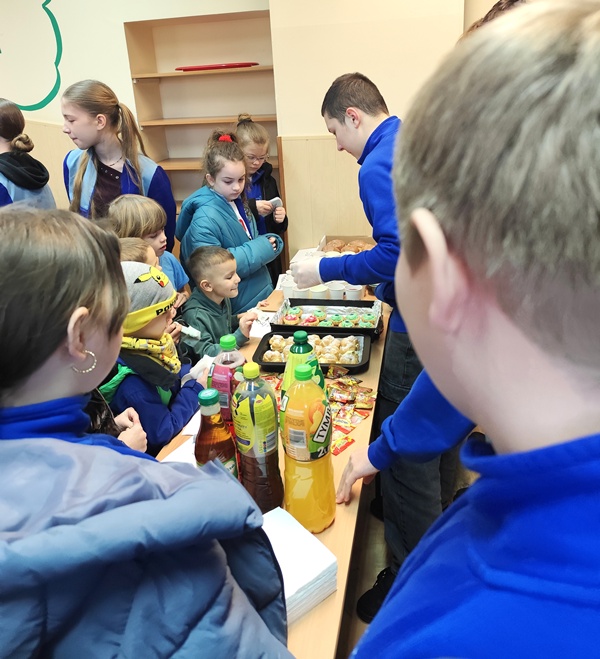 We wtorek 20 stycznia 2026 r. aula w drugim budynku szkoły zamieniła się w tętniący życiem pasaż handlowy, a klasa VIIIb w roli młodych przedsiębiorców zorganizowała prawdziwy targ. Miejsce sprzedażowe wypełniał zapach świeżych tostów, chrupiących frytek i słodkiej waty cukrowej. Obok niej można było zakupić popcorn, a kolorowe żelki, mieniąc się barwami, zachęcały do natychmiastowego spożycia. Na stołach pojawiły się też babeczki, ciasta, puszyste pączki oraz napoje orzeźwiające, dające chwilę wytchnienia między lekcjami.