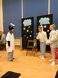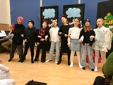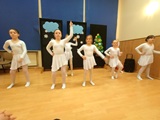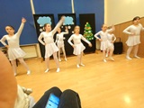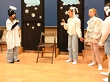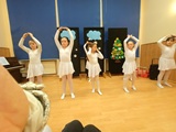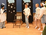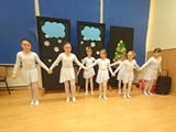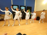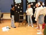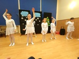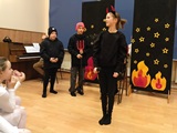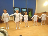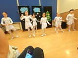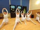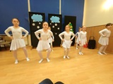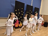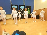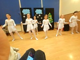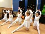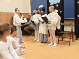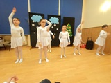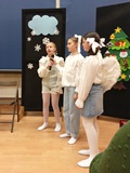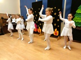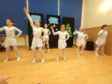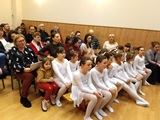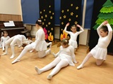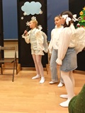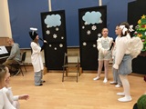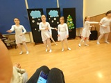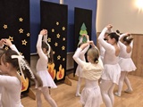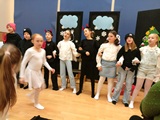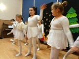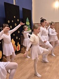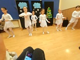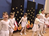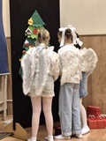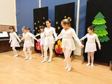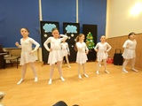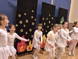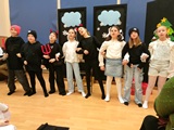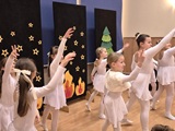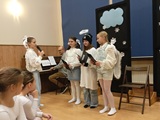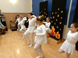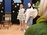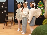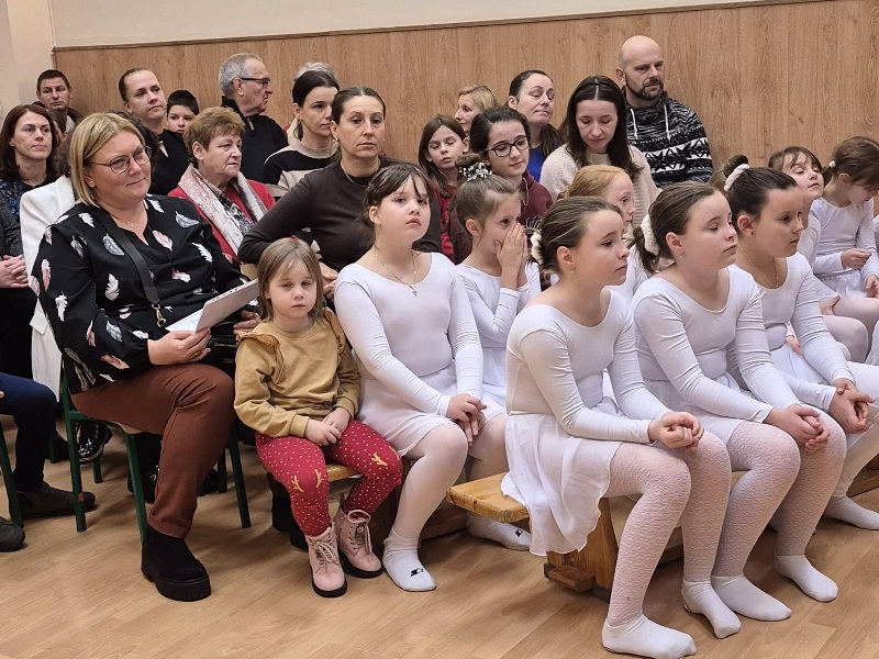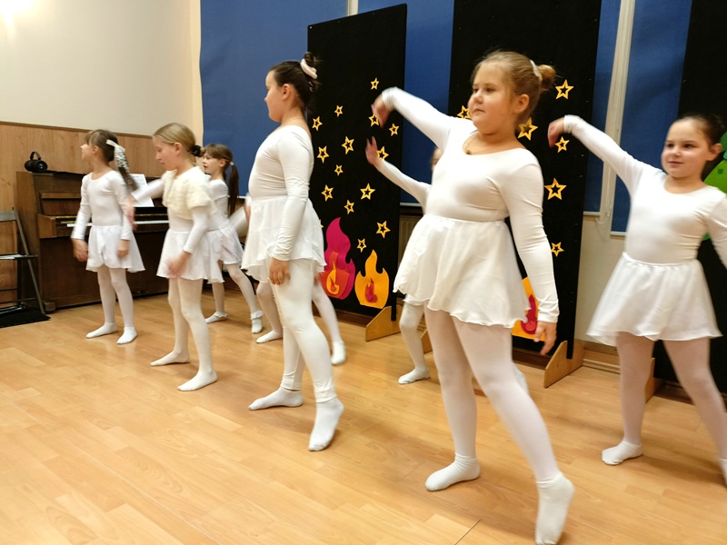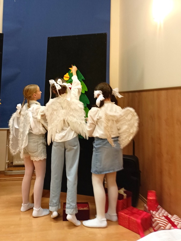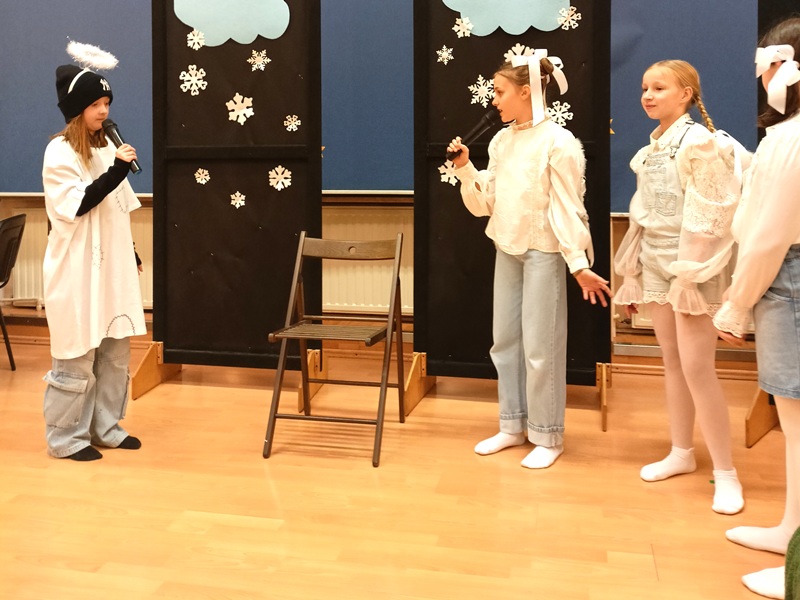 Ruch sceniczny dopełnił przekaz dzięki występom dziewcząt z koła tanecznego prowadzonego przez p. Monikę Grzywacz. Nastąpiły dwie choreografie, byliśmy świadkami dwóch odsłon ekspresji, dwóch stylów tanecznych. Najpierw pojawił się modern — płynny, liryczny, przypominający modlitwę zapisaną w geście. Następnie mieliśmy okazję zobaczyć street dance — dynamiczny, rytmiczny, zdający się pulsować energią miasta. Anielskie kostiumy dodały całości symbolicznej lekkości, a podwójna seria występów sprawiła, że taniec nie stanowił przerywnika artystycznego, lecz był równorzędnym pozasłownym komentarzem do teatralnej narracji.