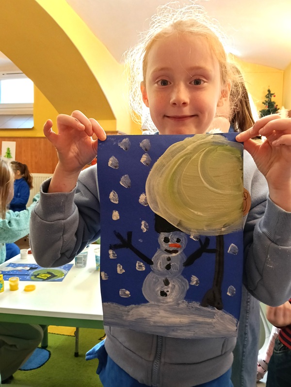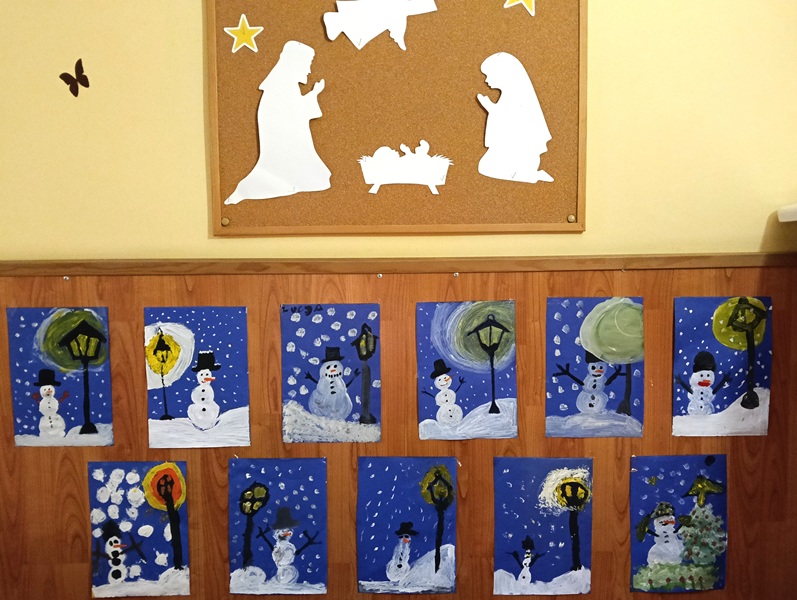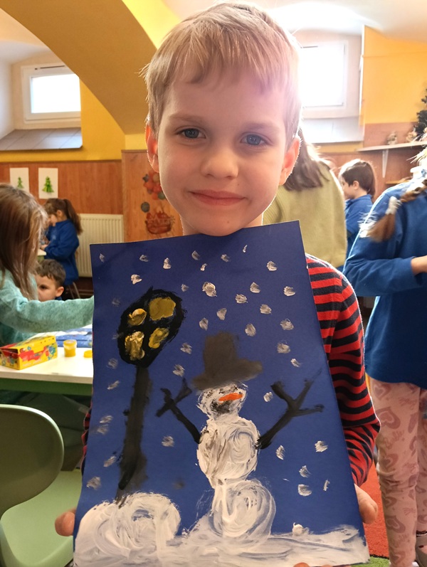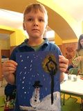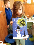 Dnia 22 stycznia 2026 r. w naszej świetlicy szkolnej wykonaliśmy kolejną już w zimowej odsłonie pracę plastyczną — bałwanek i latarnia. Malowaliśmy ją farbami na niebieskim tle, dzięki czemu obraz wyglądał jak w czasie zimowym wieczorową porą. Każdy mógł wyrazić swoją ekspresję artystyczną. Zapraszamy do obejrzenia galerii prac.