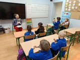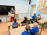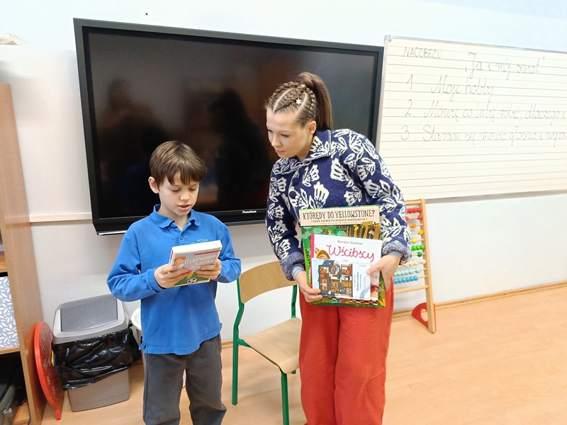Na pierwszym spotkaniu gościliśmy panią bibliotekarkę, która zaprezentowała trzy interesujące książki: "Wścibscy" Doroty Geller, "Którędy do Yellowstone? Dzika podróż po parkach narodowych" Aleksandry i Daniela Mizielińskich oraz "Czerwona kartka dla Sprężyny" Jacka Podsiadły. Spotkanie wzbudziło duże zainteresowanie i było inspirującym początkiem czytelniczej przygody.