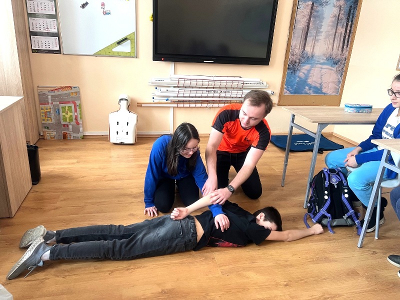 W piątek 30 stycznia 2026 r. uczniowie klasy V uczestniczyli w spotkaniu z ratownikiem medycznym, panem Szymonem Henszkem. Podczas zajęć przypomniał on podstawowe zasady bezpieczeństwa w czasie zabaw na śniegu oraz omówił, jak bez szwanku spędzać nadchodzące ferie zimowe. Ratownik zapoznał uczniów z zasadami udzielania pierwszej pomocy. Dzieci miały okazję przećwiczyć resuscytację krążeniowo-oddechową na manekinie oraz ułożyć siebie nawzajem w pozycji bezpiecznej. Dziękujemy panu Szymonowi Henszkemu za cenne wskazówki i praktyczną lekcję bezpieczeństwa.