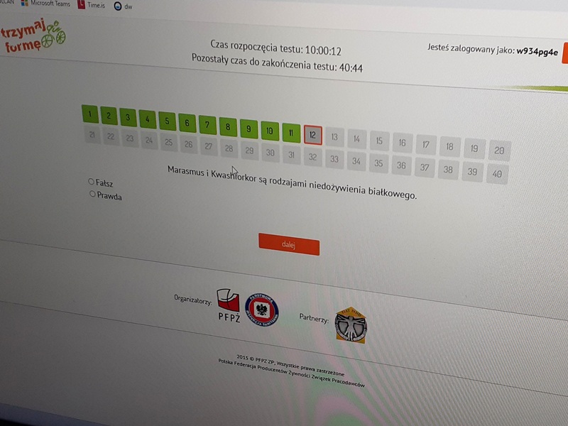 W piątek 13 marca 2026 r. wzięliśmy udział w konkursie wiedzy o zdrowym stylu życia "Trzymaj Formę!". Z ciekawością sprawdziliśmy własne kompetencje z zakresu dietetyki, aktywności fizycznej oraz profilaktyki zdrowotnej, rozwiązując wymagające zadania i analizując różnorodne zagadnienia związane z codziennymi wyborami żywieniowymi. W szkolnych eliminacjach uczestniczyło pięciu uczniów. Trzy dziewczęta nie zdołały dotrzeć na sesję rozwiązywania testu online. W trakcie zmagań przypomnieliśmy sobie, jak ogromną rolę w prawidłowym funkcjonowaniu organizmu odgrywa zbilansowana dieta, bogata w makro- i mikroelementy, a także regularny ruch pobudzający układ krążenia i wzmacniający kondycję.