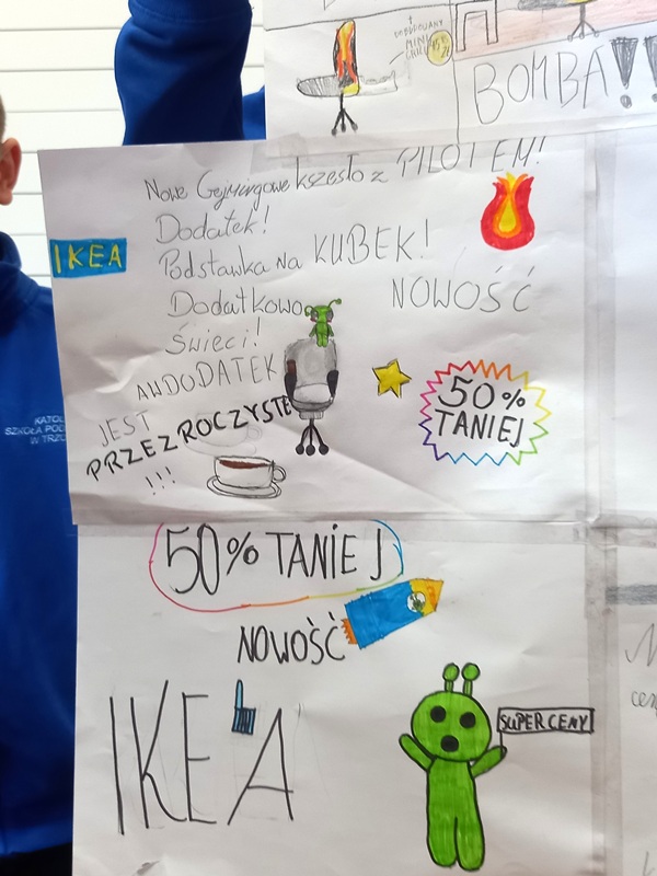 W czwartek 9 kwietnia 2026 r. klasa III w ramach tematu dotyczącego siły oddziaływania reklamy tworzyła odpowiednie projekty takich przekazów, promując własne produkty.