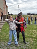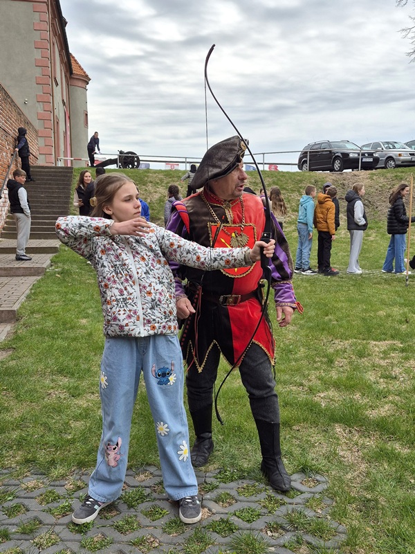 Drugi dzień naszej zamkowej przygody rozpoczęliśmy od zajęć z bractwem rycerskim — strzelania z łuku, rzucania toporkami i włóczniami do celu. Zwłaszcza strzelectwo wszystkim nam bardzo przypadło do gustu, objawiły się nawet talenty w tej dziedzinie. Potem mieliśmy grę zamkową, w której staliśmy się poszukiwaczami zaginionego skarbu Anny Wazówny. W dalszej kolejności nastąpiła krótka przerwa na obiad, a po nim następna gra terenowa, tym razem miejska. Zgłębialiśmy tajniki zabytków Golubia-Dobrzynia. Mieliśmy też słodką nagrodę. Wieczorem spędziliśmy czas przy integracyjnym ognisku, a już na koniec dnia odbył się pokaz mody piżamowej.
