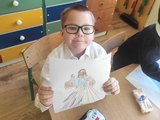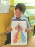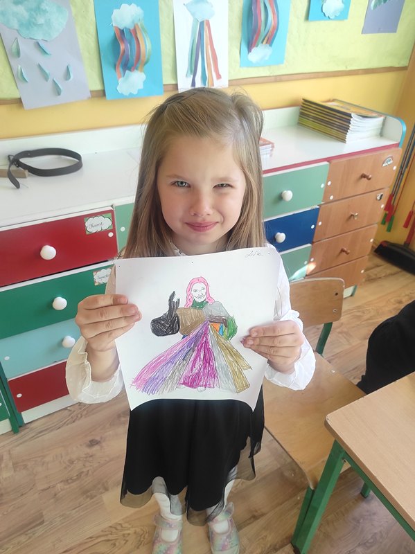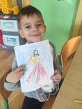 Dzieci z oddziału przedszkolnego podczas zajęć w piątek 3 października 2025 r., zorganizowanych z okazji Dnia Patrona Szkoły, wysłuchały odczytanej książki Elizy Piotrowskiej o św. Faustynie Kowalskiej. Następnie z zaangażowaniem kolorowały obrazek przedstawiający Jezusa Miłosiernego.