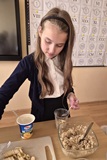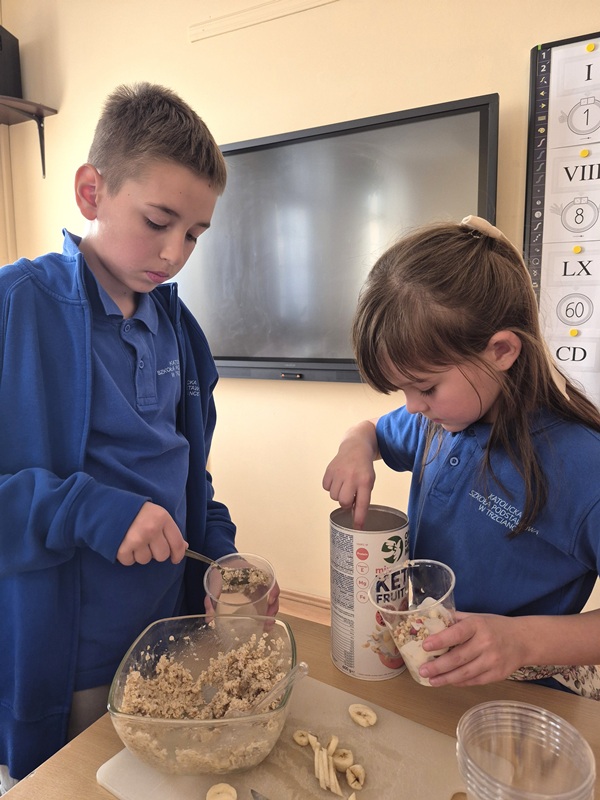 W czwartek 6 listopada 2025 r. na zajęciach literacko-kulinarnych poznaliśmy przyjaciółkę naszej książkowej Cecylki Knedelek, a mianowicie gąskę Walerię. Lubimy opowieści o mieszkańcach ul. Naleśnikowej, a jeszcze bardziej uwielbiamy ich przepisy kulinarne. Tym razem przygotowaliśmy owsiankę bananową. Są jej zwolennicy i ci, którzy za nią nie przepadają. Ciekawe, kto się zainspiruje i będzie przynosił owsiankę na drugie śniadanie?